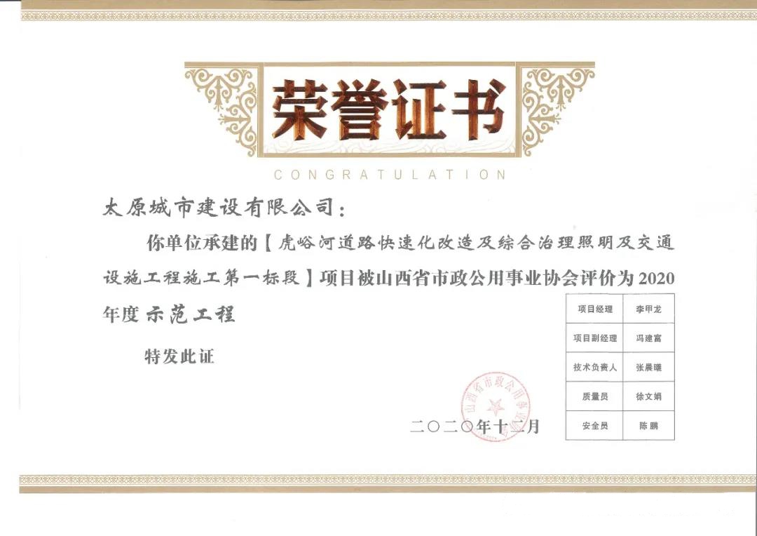 太原城建公司承建的虎峪河道路快速化改造及綜合治理照明及交通設(shè)施工程施工一標段被評為2020年度市政行業(yè)示范工程
