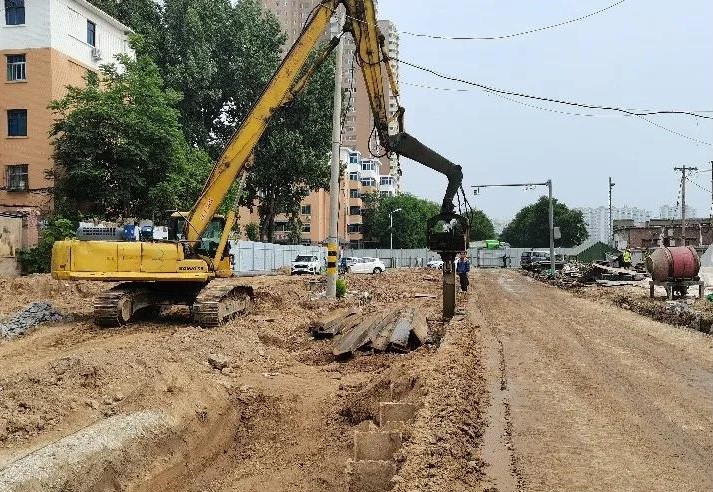 除迎新街北段外,其他道路在溝槽開挖時,都需要在施工過程中對老舊居民樓進行保護。項目部經(jīng)過仔細研究后,決定在建筑物旁采用兩排高壓旋噴樁進行隔離保護,減少施工對老舊建筑物的影響,確保工程安全。面對地下管線復(fù)雜的情況,項目部積極聯(lián)系業(yè)主,多次與煤氣、自來水、供熱等公司溝通協(xié)調(diào),最終對影響施工的管線進行改遷,為工程順利施工奠定了基礎(chǔ)。同時,迎新西一條施工范圍內(nèi)有十余根高壓電線桿,緊鄰雨污水管,因電線桿短期內(nèi)無法遷移,若進行溝槽開挖,存在極大安全隱患,為確保施工安全,項目部采用打鋼板樁的方式對電線桿進行保護,順利解決了施工難題。